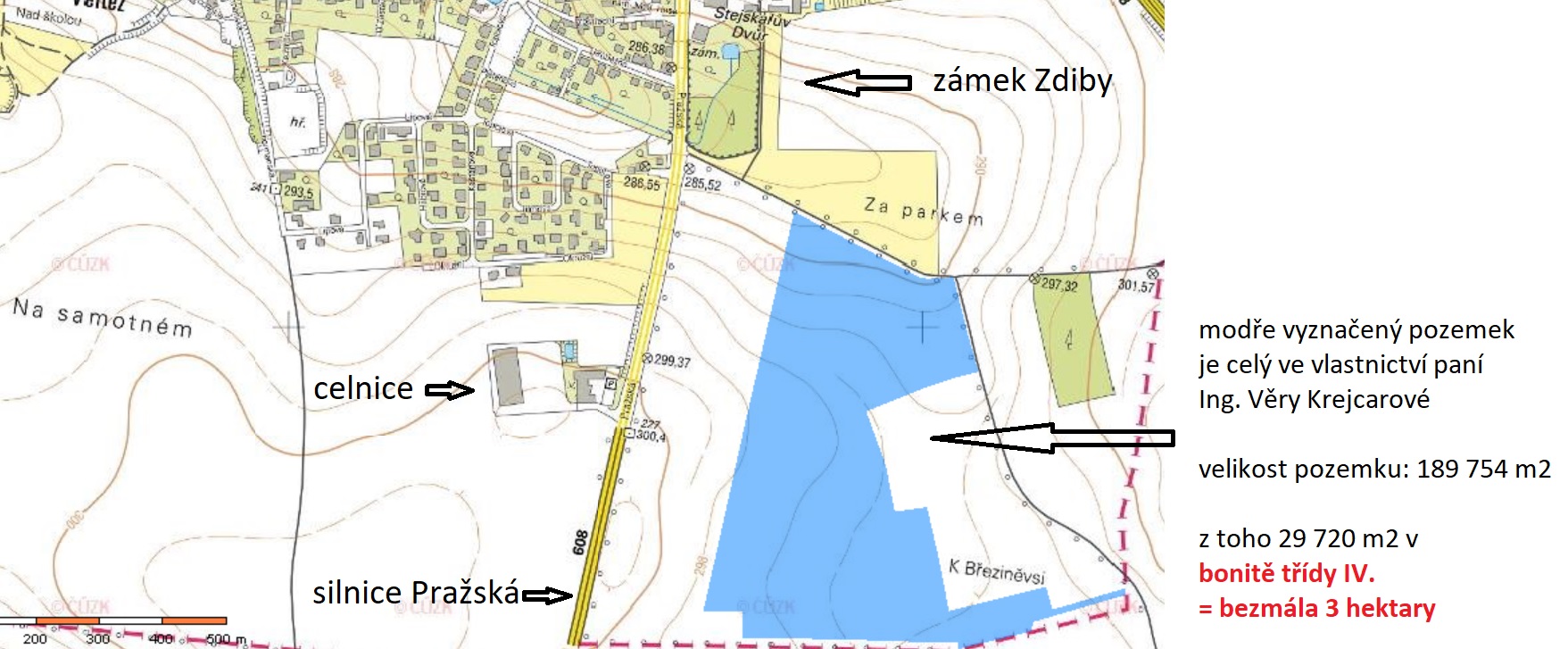 Textově: paní Věra Krejcarové, jejíž rodina kandiduje na dvou kandidátkách v brzkých komunálních volbách, vlastní poblíž zdibského zámku (pole mezi Zdiby a Chabry) pozemek o velikosti 189 754 m2(parcelní číslo 57/10; k.ú. Zdiby). Z této plochy je 29 720 m2(skoro 3 hektary) zařazeno v ochraně třídy IV., tedy nijak zvlášť přísné!