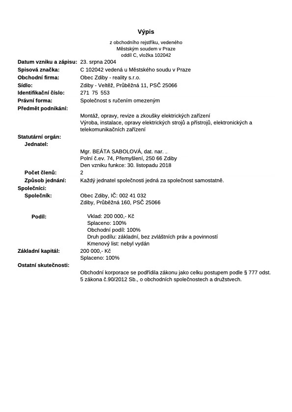 Po napsání: zajímavá shoda adres v ulici Polní, je bydliště v přímém sousedství tazatele a jednatelky firmy Obec Zdiby – reality s.r.o. Náhody se dějí.