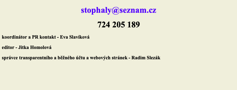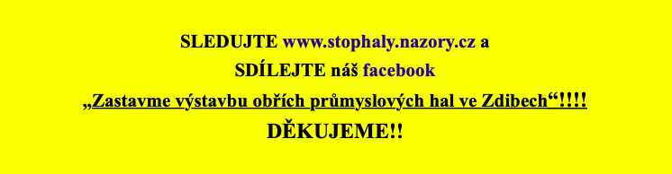 před několika lety jsme přispěli na Vámi zřízený transparentní účet nemalou částkou. Přispěli jsme Vaší iniciativě STOPHALY proti výstavbě hal ve Zdibech v domnění, že ve Zdibech haly nebudou. Tento závazek a tuto činnost jste evidentně nenaplnili a nesplnili. Zaštiťovali jste se transparentností a proto Vás žádáme, abyste na Vašich internetových stránkách popsali Vaší konkrétní činnost. Žádáme Vás, abyste popsali na jaké účely peníze odcházely a co konkrétně pro zastavení stavby hal největší příjemce našich peněz (FB advokáti), vykonal. Žádáme Vás, abyste zvážili vrácení peněz všem drobným přispěvatelům, protože se někdo může domnívat, že peníze nebyly použity správně a příspěvky mohly být zneužity.