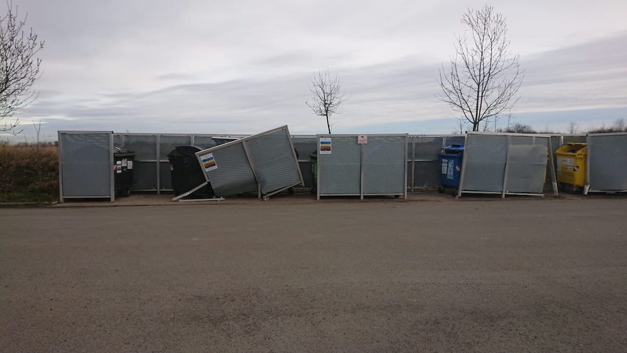 tak nám někdo zdemoloval kontejneroviště, na které jsme byli pyšní a starali se o pořádek. Posíláme foto a neviděl nebo neslyšel někdo něco v noci ze soboty na neděli? Děkujeme J.